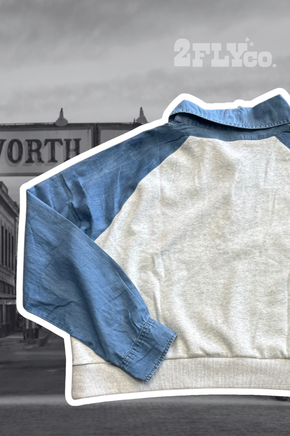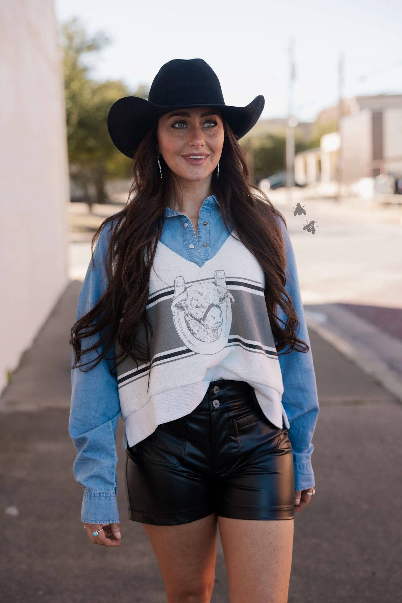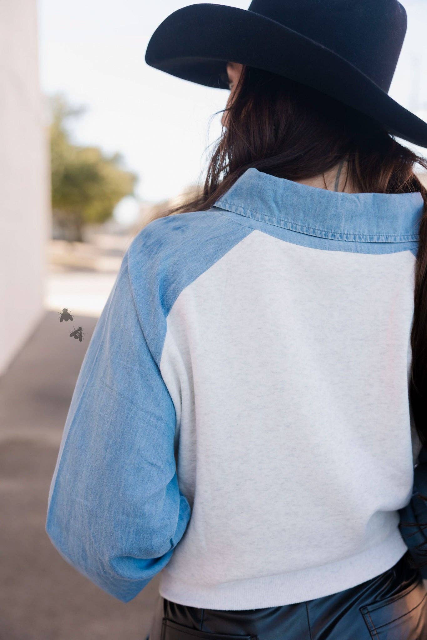 this top is giving that layering effect that we are OBSESSED with. it's a denim chambray with a printed graphic knit body.