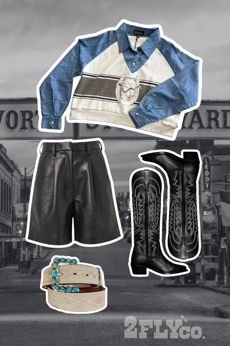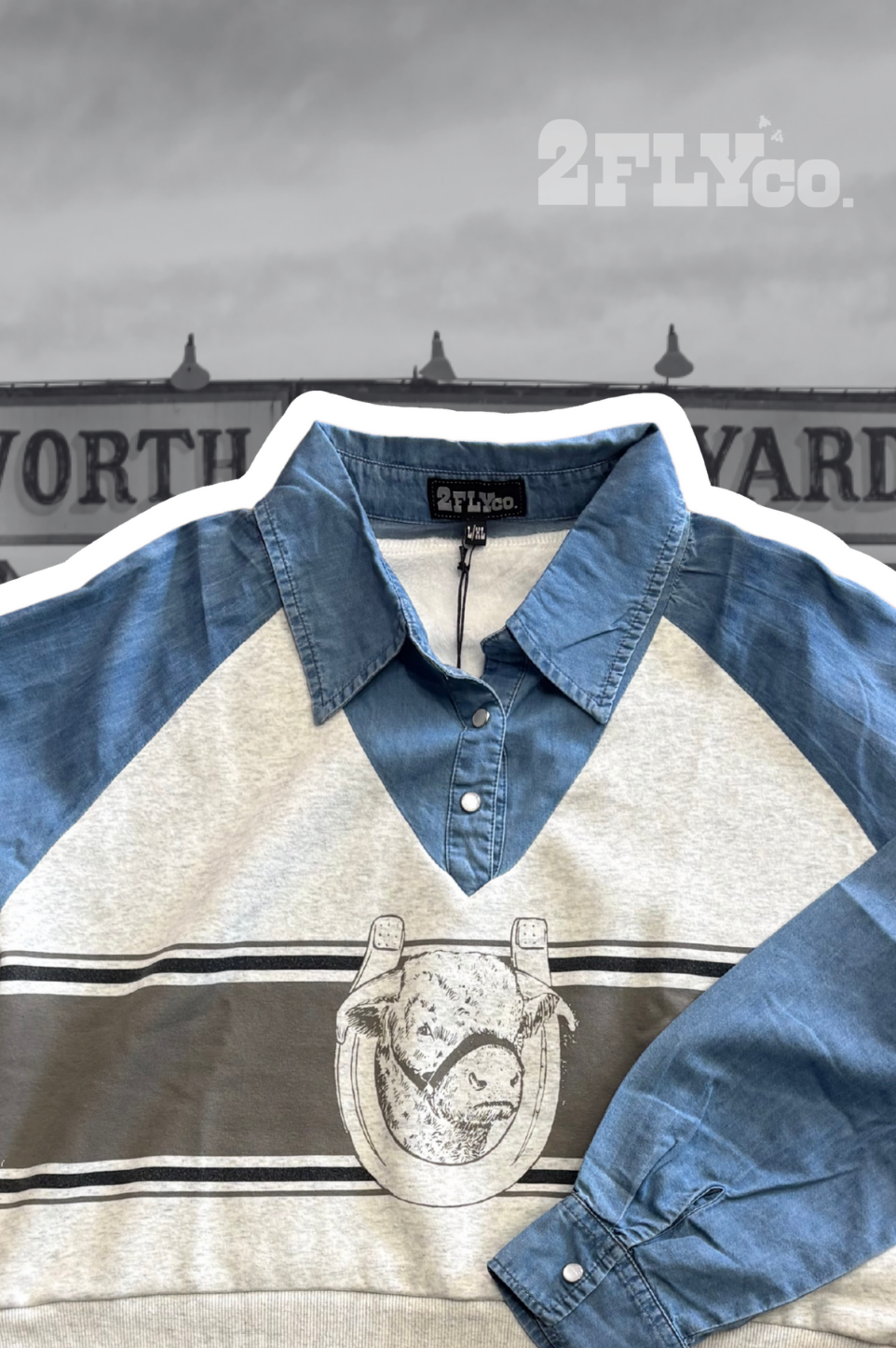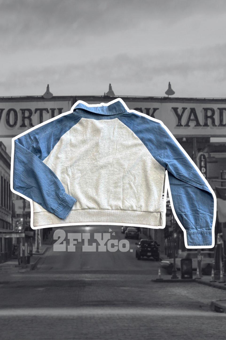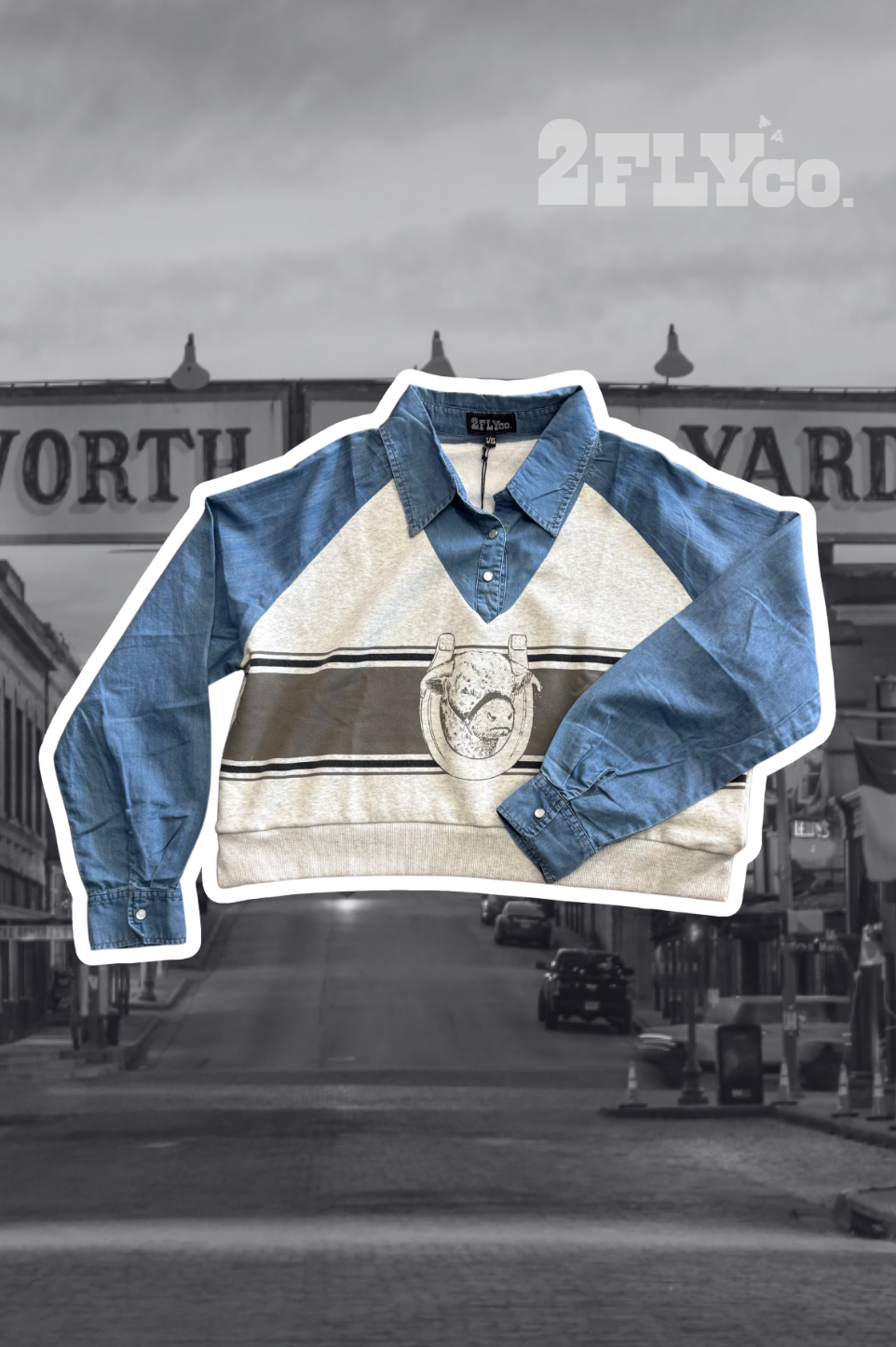 this top is giving that layering effect that we are OBSESSED with. it's a denim chambray with a printed graphic knit body.
