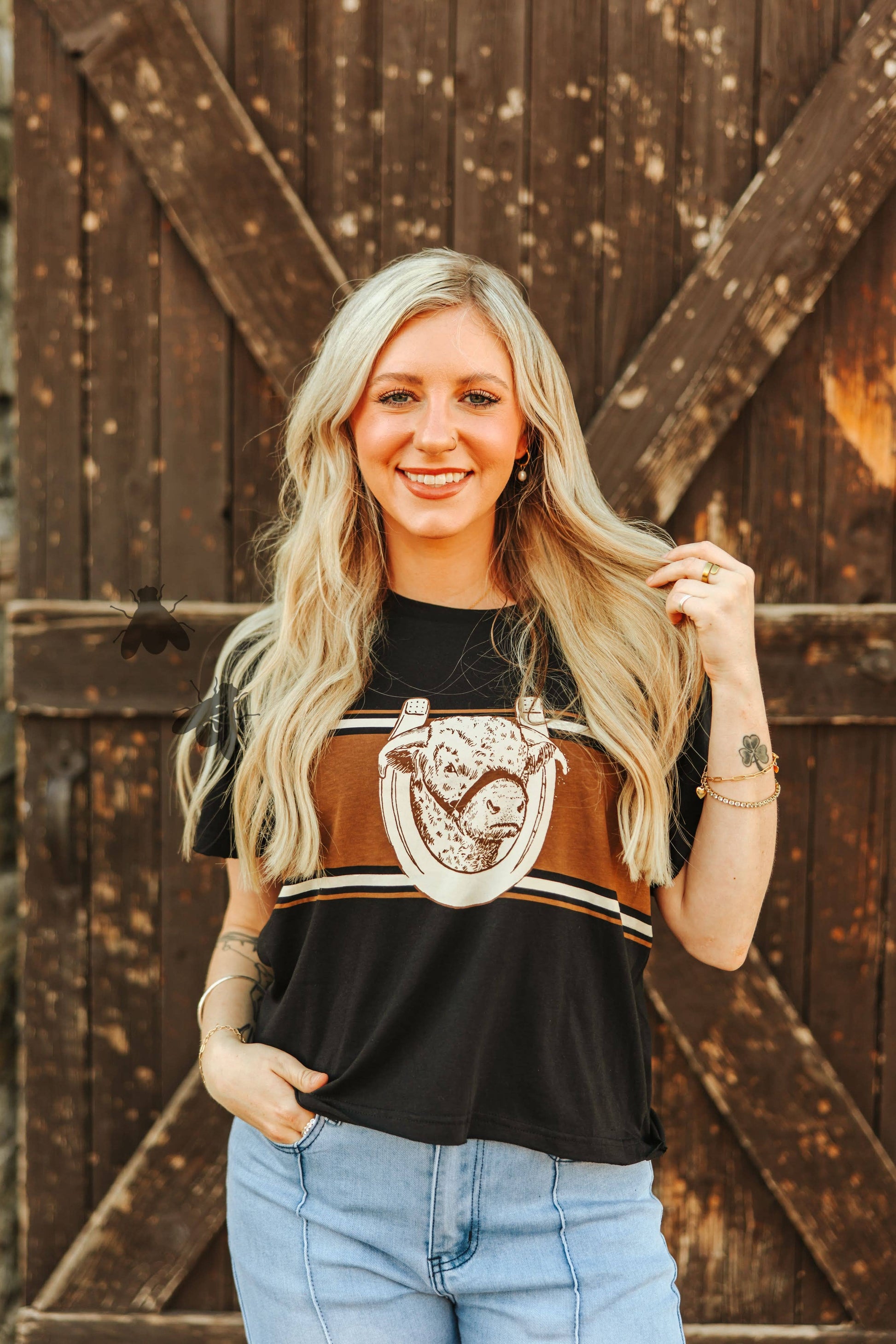Our H-Ranch Tee in Midnight from 2 Fly Co is a unique blend of Western and weird. This women's screen printed T-shirt features hand-drawn original designs, offering a touch of the unexpected. It pairs flawlessly with our Line Drives in Lightwash for a look that's both stylish and comfortable. This piece is a part of our inclusive line, catering to all from XS to 3X. So, whether you're looking for something a little western, a little weird, or a little of everything, we've got you covered. Join the 2 Fly Co family and stay fly!